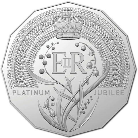 The coin’s reverse depicts Her Majesty’s cypher E II R (Elizabeth II Regina - Elizabeth the Second, Queen), bordered by lily of the valley, one of the Queen’s favorite flowers and golden wattle, Australia’s national floral emblem. The St. Edwards Crown above center is one of seventy crowns fanning out, one for each year of Her Majesty’s reign. In the exergue, divided by the flowers, the inscription "PLATINUM JUBILEE." The designer's initials (BS) are next to a flower stem below left.