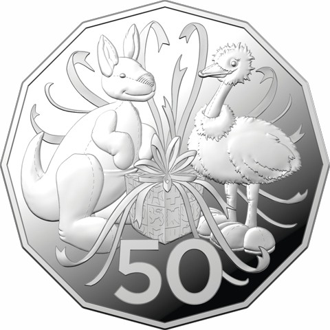 The reverse of the coin is a re-design of Stuart Devlin's realistic depiction on the definitive 50-cent piece and shows two plush toys, a kangaroo and an emu with elements of the Coat of Arms of Australia, instead of the actual Coat of Arms, and the numeral for the face value "50" below.