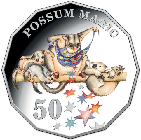 The reverse features an illustration of colored characters from the book “Possum Magic” positioned over a branch extending across the coin horizontally. The design includes a koala hanging on to that branch. Grandma Poss - a possum - is wearing glasses, slippers and an apron with stars printed on it and is pouring multi-colored irregular star shapes from her apron. Two possums are looking down at the falling stars surround by the inscription "POSSUM MAGIC" above . The face value 50 is placed below left.
