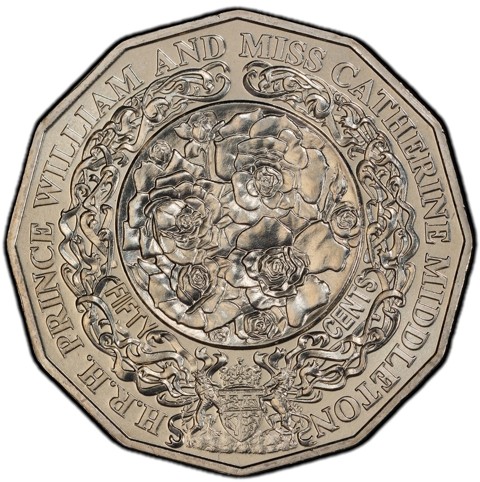 The reverse features a collection of roses (Australian fauna) in a circle and Prince William's coat of arms surrounded by ornate ribbons. The inscription identifying the theme "H.R.H. PRINCE WILLIAM AND MISS CATHERINE MIDDLETON" around.