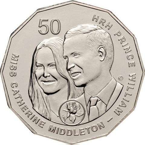 The reverse features a detailed sculpted portrait of the couple which went through a highly consultative approval process with Her Majesty The Queen. There is a rose within a circle between them. The designer's initial (G) is embedded in a small circle in the right field. The face value 50 is in the top left field. Around, MISS CATHERINE MIDDLETON - HRH PRINCE WILLIAM.