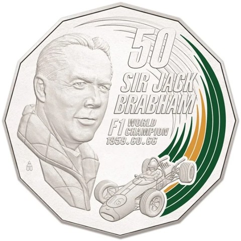 The reverse depicts a portrait of Brabham and a green and gold track and the same racing car in which Brabham became the one and only Formula 1 driver to ever win a World Championship in a car of his own construction,, the colors of his original car, face value "50" above below it in five lines inscription identify theme with date of winning Formula 1.