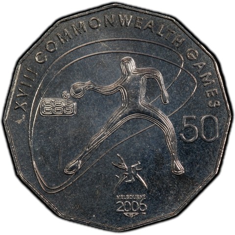The reverse design, a central figure is a stylized line drawing of a person playing table tennis. Two interlocking freehand-style loops are placed in the background. Reading the text and other devices, from 9 o'clock to 3 o'clock: 'XVIII COMMONWEALTH GAMES' written around the curve of the rim; at 4 o'clock 'MELBOURNE 2006', is surmounted by Games logo, presented horizontally ; '50' is written horizontally, next to the rim at 6 o'clock.