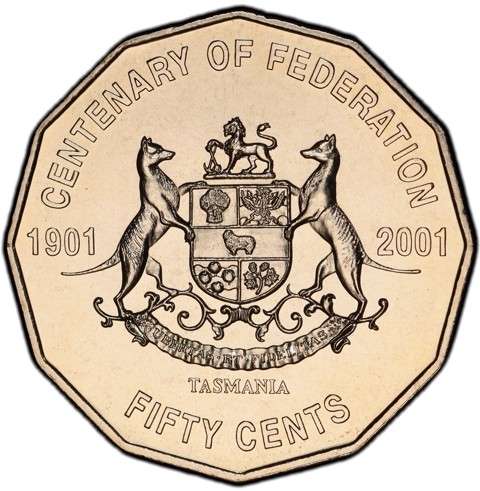 The reverse design features Tasmania's Coat of Arms (Tasmania's Coat of Arms features two Tasmanian Tigers supporting the shield. The sheild features symbols of Tasmania's industry: hops, a sheaf of wheat, a ram, apples and a thunderbold which refers to Tasmania's hydro-electric power system. The 'passant' lion, a traditional symbol of heraldry which is also featured in the State badge appears in the crest. The lion hold a pick and shovel to represent mining. Tasmania's Latin motto 'Ubertas et Fidelitas' or 'Fruitfulness and Faithfulness' appears at the base of the Coat of Arms.) granted by King George V in 1917, representing one of 9 states and territories that make up Australia. Flanking the Coat of Arms are the dates 1901 and 2001. Around above, CENTENARY OF FEDERATION. Below the Coat of Arms, TASMANIA. Around below, the face value FIFTY CENTS.