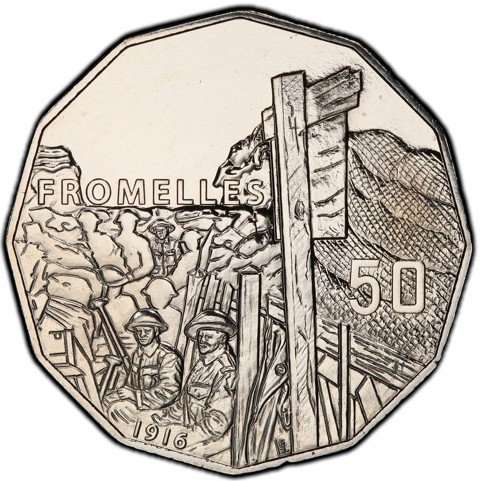 The coin’s reverse features troops of the 53rd Australian Battalion from the 5th Australian Division sitting in a trench, only three of the men survived the battle of Fromelles, all wounded. The date of battle below, and the inscription identify theme "FROMELLES" above soldiers . The initials of the designer (EJ.L) below right next to inscription.