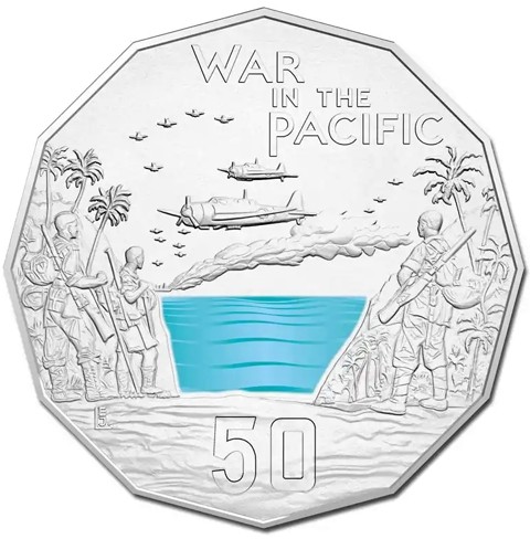 The Reverse design depicts Australian Soldiers looking out over a colored Pacific Ocean standing beside Palm Trees. Flying overhead are Japanese Zero Fighter Bombers. In the background is a Merchant Ship that has been hit and is on fire. The inscription identify theme in three lines "WAR IN THE PACIFIC" above. The initials of the designer (EJ.L) below left. Below the numeral of denomination the face value (50).