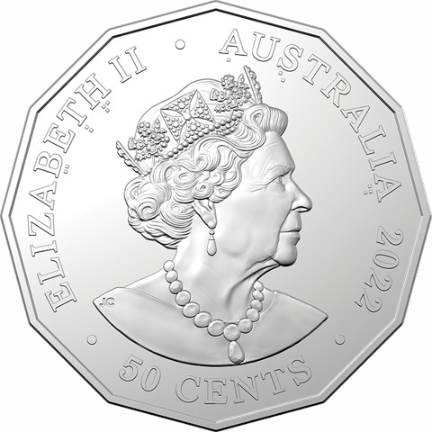6th crowned portrait of HM Queen Elizabeth II facing right (the Commonwealth effigy), wearing the George IV State Diadem, the Coronation Necklace and Earrings framed by inscriptions “ELIZABETH II,” “AUSTRALIA, 2022” the denomination “50 CENTS.”