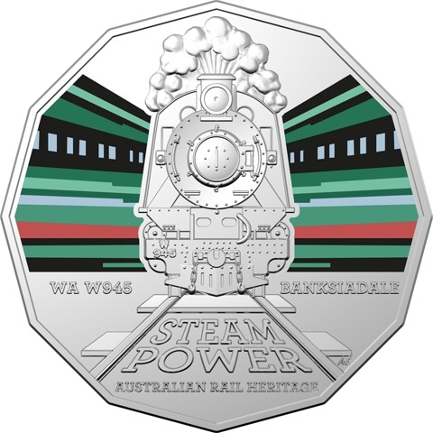 The reverse portrays a front view of the Western Australia, the W945 ‘Banksiadale’ steam train that hauling timber from Darling Range’s sawmills. It played a key role in the state’s timber industry with a colored print of the engine’s distinctive black, green and red color in the both sides. Below the exergue line, divided by the locomotive, the inscription "WA W945 BANKSIADALE." On three lines at center below, "STEAM POWER AUSTRALIAN RAIL HERITAGE." The designer's initials (AS) are below right.