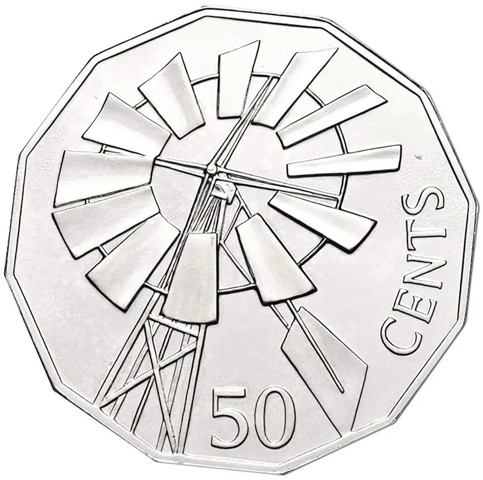 The reverse features a windmill, an iconic outback feature that stands guard over the precious Australian water supply. Around right, the face value 50 CENTS.