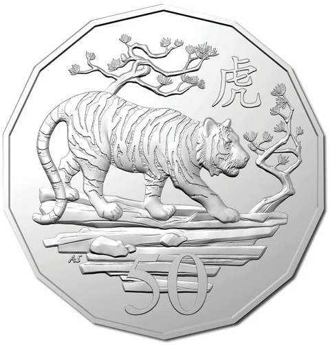 The reverse of the coin shows a tiger walking to right, with trees in the background. The Chinese character (虎) for "tiger" above right and the face value 50 below. The designer's initials (AS) are below left.