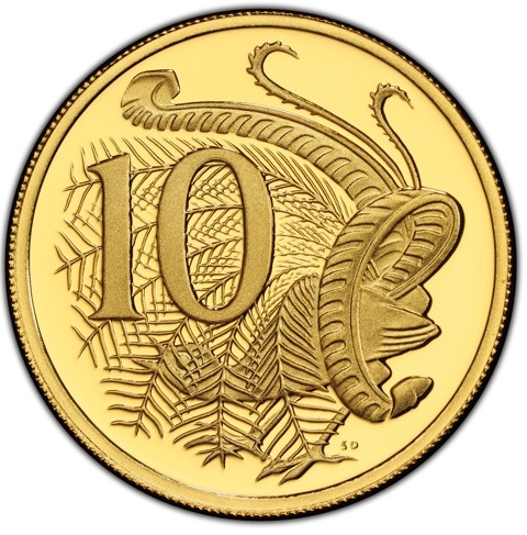 The reverse depicts a lyrebird seen facing left, with its tail plumes expanded forward over its head. The denomination numeral 10 is above the head of the bird; in tiny letters initials of designer (SD)below, in the right field beside its foot.