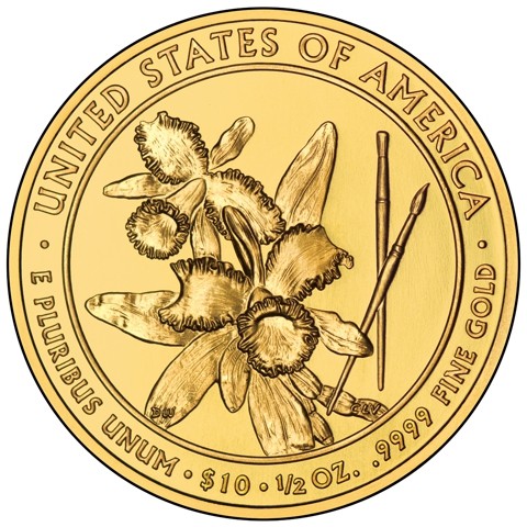 The reverse design selected for the coin features an orchid and paint brushes to represent the First Lady’s interest in china-painting and Mrs. Harrison's love of flowers.