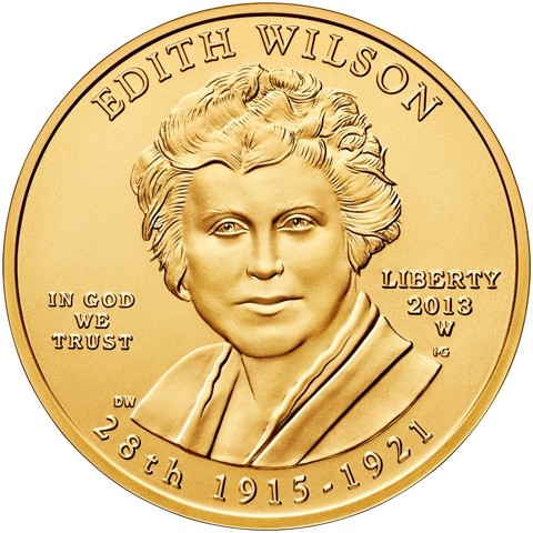 The obverse of the coin features a front facing portrait of the First Lady. The portrait is surrounded by the required inscriptions of the name “EDITH WILSON”, the motto “IN GOD WE TRUST”, “LIBERTY”, the date and mint mark “2013 W”, the order of the Presidency “28TH”, and the dates served in office “1915-1921”.