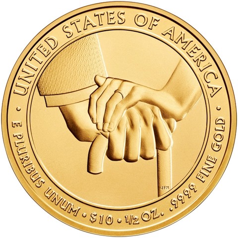 On the reverse is the image of Mrs. Wilson supporting her husband who had suffered a massive stroke while in office. Her hand rests upon his, which holds a cane. The inscriptions include “UNITED STATES OF AMERICA”, the motto “E PLURIBUS UNUM”, the denomination “$10”, the the precious metal weight and purity of “1/2 OZ. .9999 FINE GOLD”.