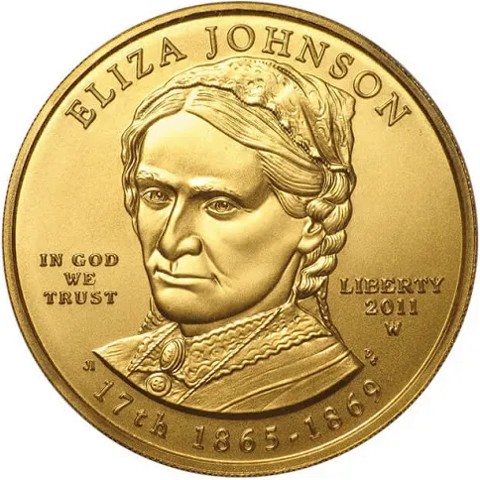 The obverse of the coin features a portrait of Eliza Johnson designed by Joel Iskowitz. The inscriptions include “ELIZA JOHNSON”, “IN GOD WE TRUST”, “LIBERT”, the order of the Presidency “17TH”, the dates of the term “1865-1869”, the issue date, and the mint mark.