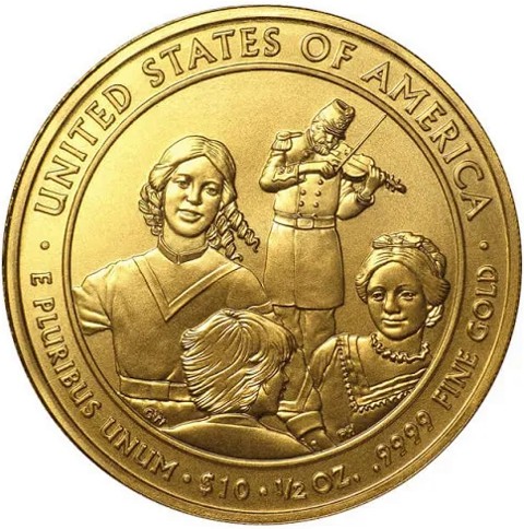 The reverse of the coin is intended to represent the First Lady’s love of children. It features a scene from the children’s ball held for President Andrew Johnson’s 60th birthday. Three children are dancing and a Marine Band fiddler is present in the background. When the Citizens Coinage Advisory Committee reviewed design candidates, they believed that this option, in which the First Lady was not present, was a more symbolic representation of the event. The design was created by Gary Whitley. Reverse inscriptions around the outer edge of the coin include “UNITED STATES OF AMERICA”, “E PLURIBUS UNUM”, the nominal face value “$10”, the gold content and fineness “1/2 OZ. .9999 FINE GOLD”.