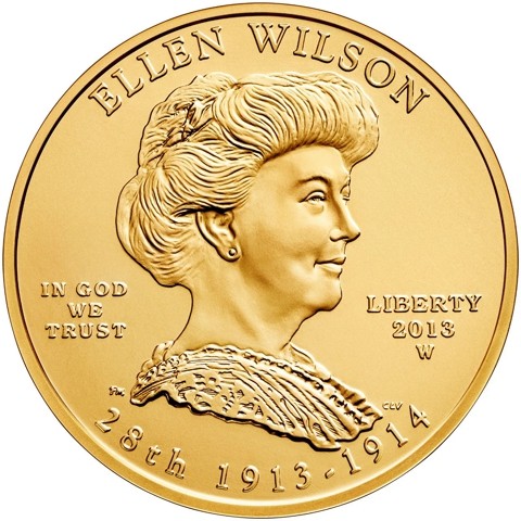 The obverse featured a near profile portrait of Ellen Wilson. The surrounding inscriptions read “ELLEN WILSON”, “IN GOD WE TRUST”, “LIBERTY”, “2013 W”, “28TH”, and the dates as First Lady “1913-1914”.