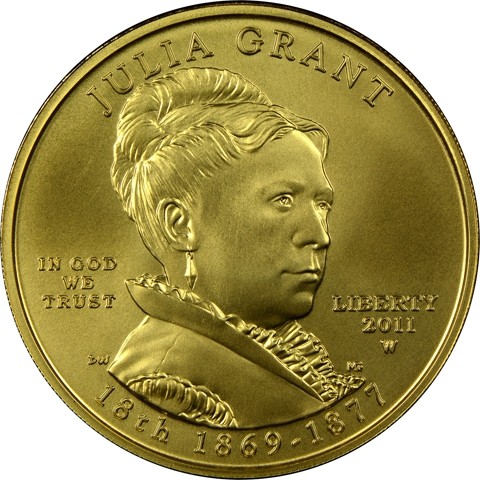 On the obverse of the coin is a portrait of the First Lady. The required inscriptions surround the portrait, “JULIA GRANT”, “IN GOD WE TRUST”, “LIBERTY”, “2011”, “18TH”, and “1869-1877”.