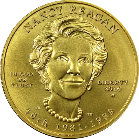 The obverse design for the Nancy Reagan First Spouse Gold Coin features a front-facing portrait of the First Lady. The inscriptions include “NANCY REAGAN”, the motto “IN GOD WE TRUST”, “LIBERTY”, the order of the Presidency “40TH”, and the dates served “1981-1989”.