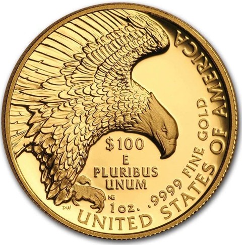 The reverse features a bald eagle as it prepares to land at the right side. Along the right edge runs the inscription "UNITED STATES OF AMERICA.", the weight, purity and metal are below right and $100 face value below the eagle's neck.
