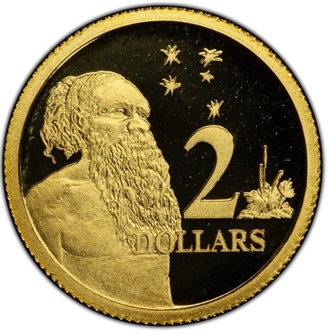 The reverse depicts an Aboriginal Elder (half-length figure of Aboriginal male, bare-chested, facing three-quarters right), the Southern Cross constellation above right, and a grass tree below right. To the right of the man, on two lines the face value and denomination "2 DOLLARS."