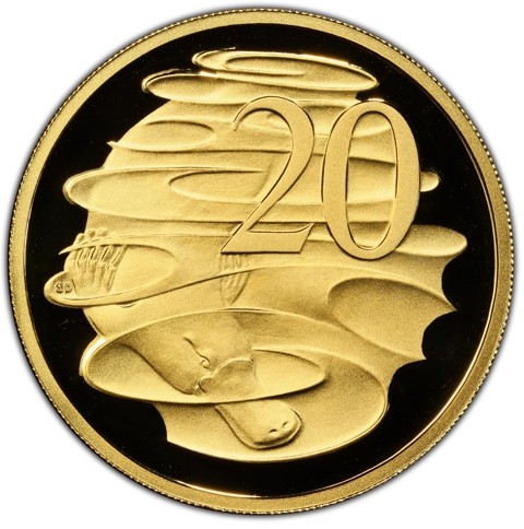 The reverse depicts a platypus swimming. The denomination numeral 20 is above the head of the animal; the designer 's initials SD are in tiny letters, within the swirl of water around its right forepaw.