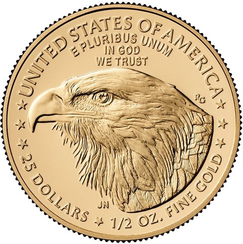 The reverse design features a portrayal of a majestic eagle. Inscriptions are “UNITED STATES OF AMERICA,” “E PLURIBUS UNUM,” “IN GOD WE TRUST,” “25 DOLLARS,” and “1/2 OZ. FINE GOLD.”