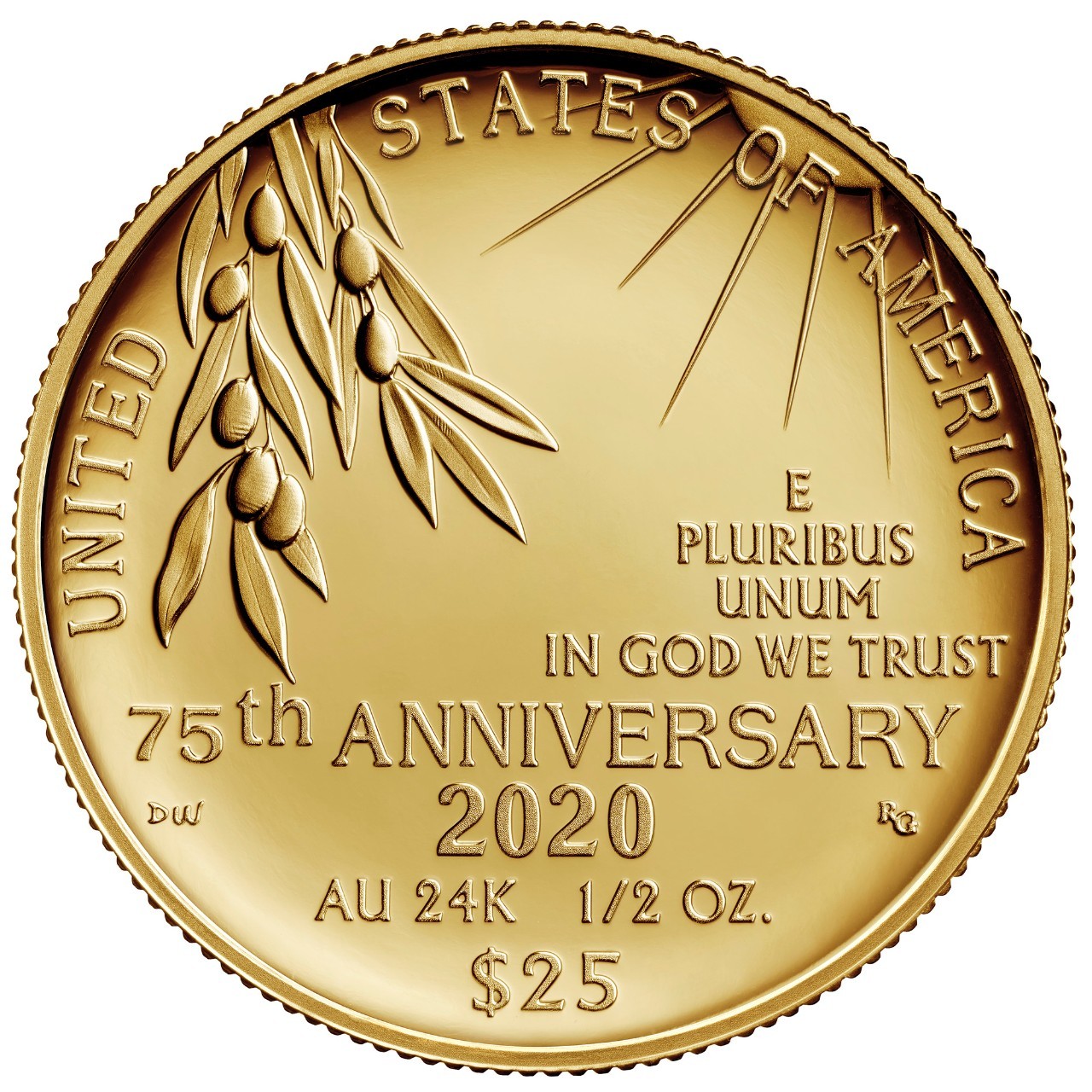 The reverse design echoes the sun element on the obverse of the 1945 Victory Medal. The sun from that medal has, 75 years later, risen to noon day brilliance. It shines on the symbolic olive branches on the left.