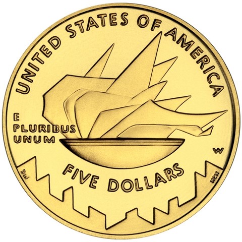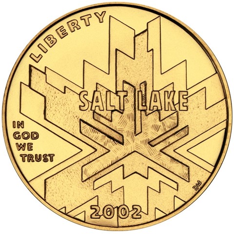 The obverse of the gold five-dollar features the 2002 Salt Lake Olympic Winter Games Crystal Emblem superimposed on top of the Games' secondary identity mark entitled: "Rhythm of the Land."