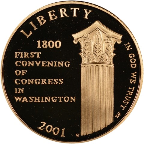 The obverse designed by Elizabeth Jones, depicts the top of a Corinthian column and the words "First Convening of Congress in Washington".