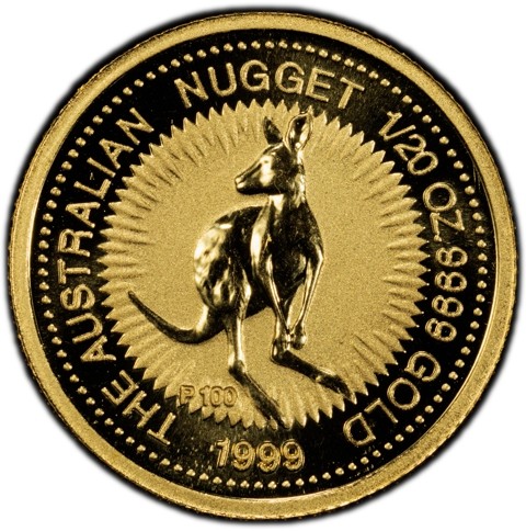 The reverse features a representation of a detailed depiction of a Grey standing facing looking left surrounded by a starburst background (stylized rays of sunlight not quite reaching the center). Above the image, the words “THE AUSTRALIAN NUGGET 1/20 OZ. 9999 GOLD” curve around the top edge, while below the design, the year “1999.” The layout is clean and the engraving crisp, highlighting the artistic capabilities of the Perth Mint’s master engravers. The P100 signifying The Perth Mint’s 100th anniversary is above the date.