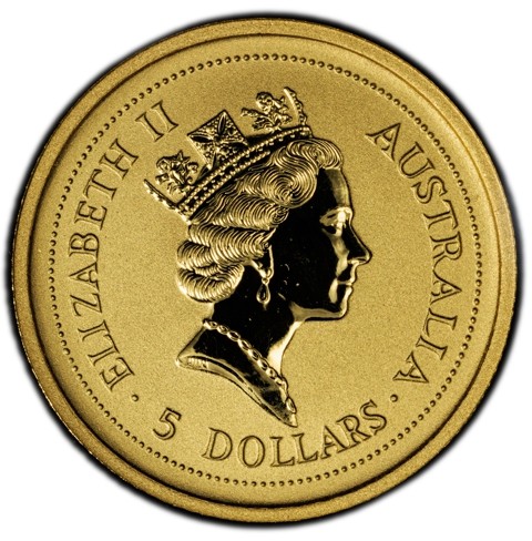 Third crowned portrait of HM Queen Elizabeth II facing right, wearing the George IV State Diadem framed by inscriptions ELIZABETH II, AUSTRALIA, and the face value “5 DOLLARS” below.