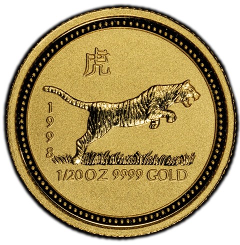 The reverse shows a tiger pouncing off the ground, ready to attack its prey. The Chinese character (虎) for tiger is above, the year 1998 vertically to the left and the inscription "1/20 OZ 9999 GOLD" is placed along the rim and the Perth Mint's mark, "P," is not included.