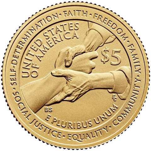 The reverse depicts both arms of an individual firmly clasping one arm of another individual, symbolizing the aid and care that Harriet Tubman offered to others throughout her life. Encircling the arms are inscriptions of Harriet Tubman’s seven core values.