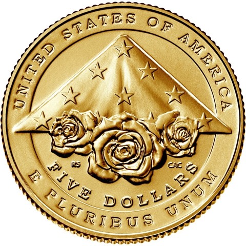 The reverse design depicts a folded flag with three roses beneath symbolizing remembrance.