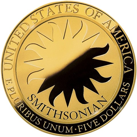 The reverse of the coin features a design of the Smithsonian's sunburst logo and the word "Smithsonian". The design elements of the foreground of the coin are raised and frosted, and the sunburst on this version of the coin is incused and highly polished with a frosted background.