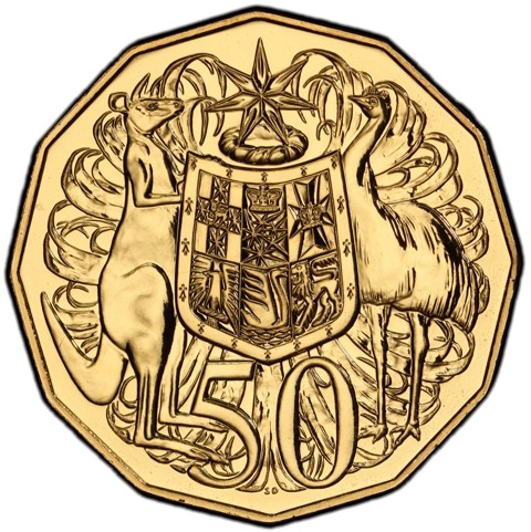 The reverse depicts Coat of Arms of the Commonwealth of Australia, based on those authorized by Royal Warrant 19 September 1912 - composed of a shield divided into six parts, each containing a representation of the badge of a State. The shield is supported by a kangaroo and an emu. The shield sits on the denomination numerals, 50; above the shield is the Federation star. The entire design is set above a field of stylized wattle leaves. Designer's initials "SD" in tiny letters are in the field below the numerals..