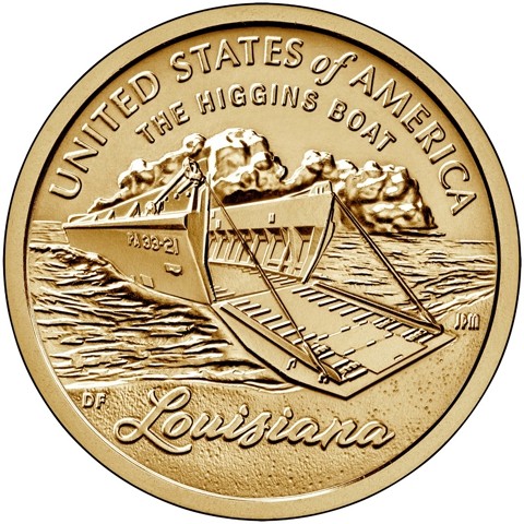 The reverse design depicts a Higgins Boat as it would have been deployed during World War II with its innovative landing ramp open against a beach.