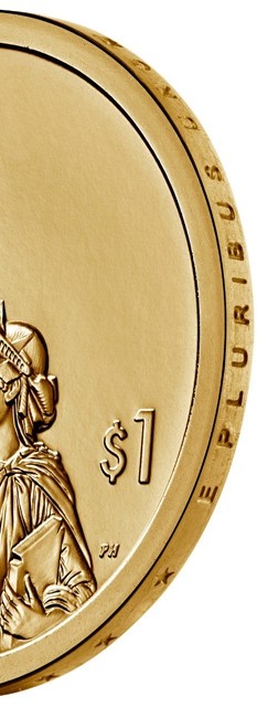 The obverse design features a dramatic representation of the Statue of Liberty in profile with the inscriptions “IN GOD WE TRUST” and “$1.” The design also includes a privy mark of a stylized gear, representing industry and innovation.