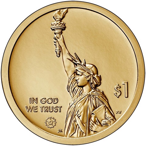 The obverse design features a dramatic representation of the Statue of Liberty in profile with the inscriptions “IN GOD WE TRUST” and “$1.” The design also includes a privy mark of a stylized gear, representing industry and innovation.