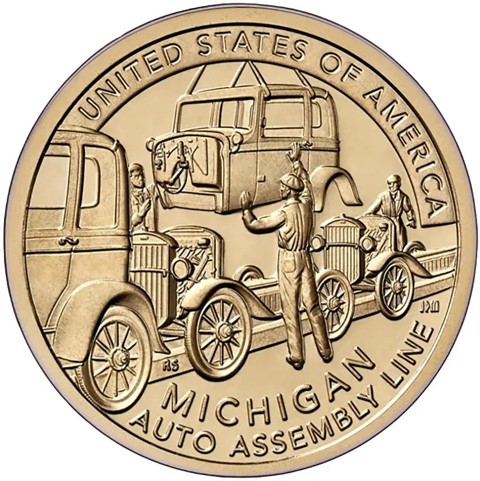 This design features a 1930s-era assembly line where a team of auto workers lowers an automobile cab into place. Inscriptions are “UNITED STATES OF AMERICA,” “MICHIGAN,” and “AUTO ASSEMBLY LINE.”
