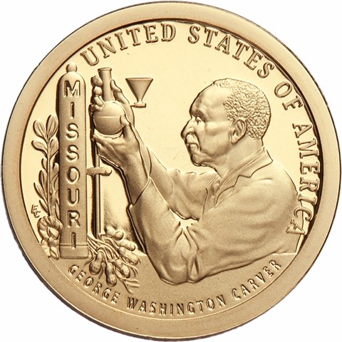 The reverse design presents a depiction of George Washington Carver gently smiling while examining a sample of his work in his laboratory. The leaves, blossoms, and fruits of a peanut plant weave between scientific equipment. Inscriptions include “UNITED STATES OF AMERICA,” “MISSOURI,” and “GEORGE WASHINGTON CARVER.”