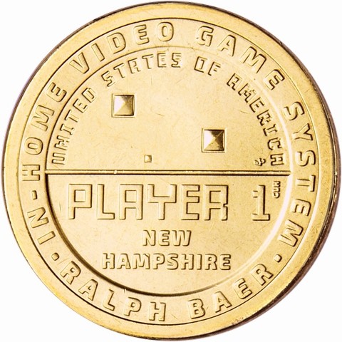 The reverse (tails) design by Christina Hess depicts Ralph Baer’s brown box game “Handball” on the right side of the coin. The left side of the coin features “NEW HAMPSHIRE” and “PLAYER 1” on an incused background. “IN HOME VIDEO GAME SYSTEM” and “RALPH BAER” encircles the outside of the coin in a text that is meant to pay homage to Ralph Baer’s Odyssey game. The additional inscription is "UNITED STATES OF AMERICA." The design of the coin is also symbolic of an arcade token.
