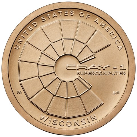 This design exhibits a stylized aerial view of the Cray-1 supercomputer. The image emphasizes the Cray-1 not only through its shape, but also by suggesting the shape of a “C” for Cray-1 and “computer.” Inscriptions are “UNITED STATES OF AMERICA” and “WISCONSIN.” The additional inscription is “CRAY-1 SUPERCOMPUTER.”