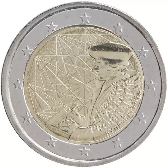 Mix of two major elements of the Erasmus programme: the original intellectual inspiration, Erasmus himself, and the allegory of its influence over Europe. The first one is symbolized by one of the most known depictions of Erasmus. The second one is symbolized by a beam of links going across the coin from a beacon to another, representing the numerous intellectual and human exchanges between the European students. As a reference to Europe, some of these links form other stars, born from the synergy between the countries. The figure 35, for 35th anniversary comes out from the stars in a contemporary graphical style. The coin’s outer ring bears the 12 stars of the European flag.