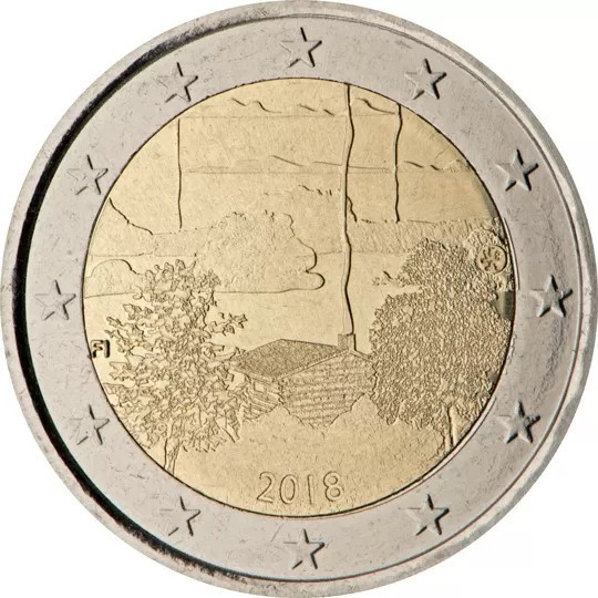 Finnish landscape with a typical Finnish lakeside sauna placed in the centre. The year of issue is placed at the centre bottom. The indication of the issuing country ‘FI’ is at the centre left and the mint mark at the centre right. The coin’s outer ring bears the 12 stars of the European Union.
