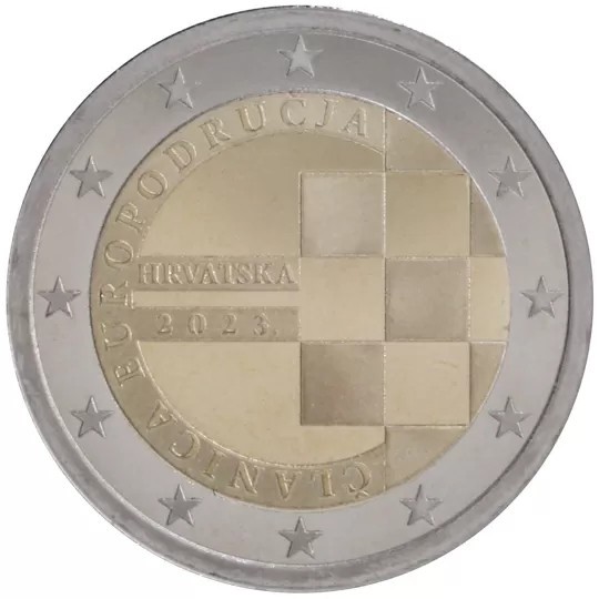Inscriptions of the issuing country and the year of issue, depicted horizontally, as well as the words ‘ČLANICA EUROPODRUČJA’ (member of the euro area), which are inscribed along the outer edge of the coin’s core. These inscriptions symbolically form a stylized symbol of the euro ‘€’. The other central motive of the coin is Croatia's distinctive and recognizable symbol, the Croatian checkerboard, which represents part of the Coat of Arms of the Republic of Croatia. The coin’s outer ring bears the 12 stars of the European flag.