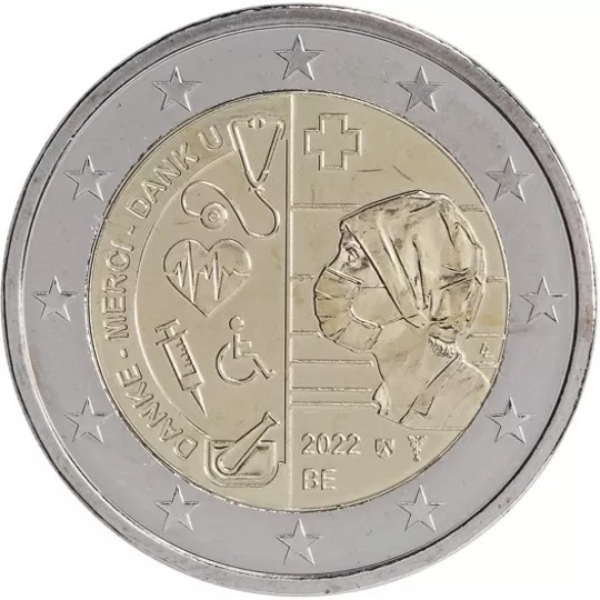 Health personnel. At the left you can find the inscription ‘Danke – Merci – Dank u’ together with various pictograms referring to healthcare sector. From top to bottom, a cross, a stethoscope, a heart, a syringe, a wheelchair and a chemical mixture are shown. At the far right are the initials of the designer Luc Luycx located. As the Royal Dutch Mint will strike the coins, the mintmark of Utrecht, a mercury staff is located on the bottom together with the Belgian mint master mark, the Coat of Arms of the municipality Herzele, the country code BE and the year mark 2022. The coin’s outer ring bears the 12 stars of the European flag.
