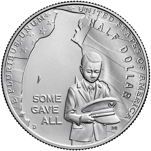 The reverse design features a young boy holding the dress cap of an enlisted Marine. The silhouette of a Marine in dress blues stands behind him in negative space, emphasizing the loss that affects the families of Purple Heart recipients. The inscription “SOME GAVE ALL” is featured in the negative space around the boy in the lower half. The obverse’s background field flag motif is repeated.