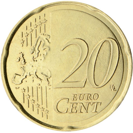 Map of Europe without internal borders, extending beyond the geographical area of the European Union. Six fine lines cross the design (interrupted by land masses), each ending with a star, representing the twelve stars of the European flag. The denomination appears to the left of the map.